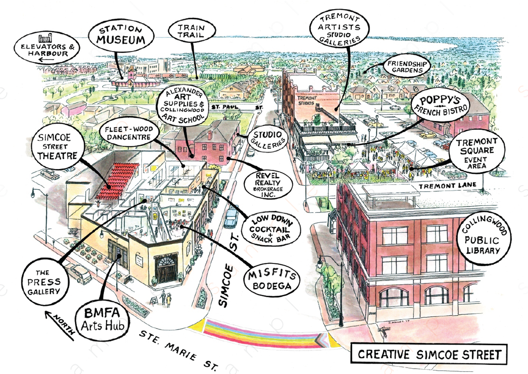 The building now houses a café, art classes and exhibit space on the main floor. The second floor is home to Tremont Studios – nine individual artist studios in the original corridor and hotel room layout. The third floor has four residences, returning a residential element to the former hotel. The revitalized building is now part of a vibrant arts community known as Creative Simcoe Street.